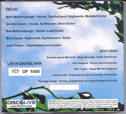 Gatefold 2 CD set. Recording of Devo's 7/23/04 Summerstage concert by DiscLive. Only 1000 made/each numbered.