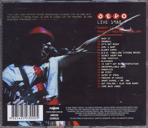 Classic DEVO show - Aug. 17, 1980 - Phoenix Theatre, Petaluma, CA. Unlike the USA release, this is an audio-only CD with no DVD capabilities.